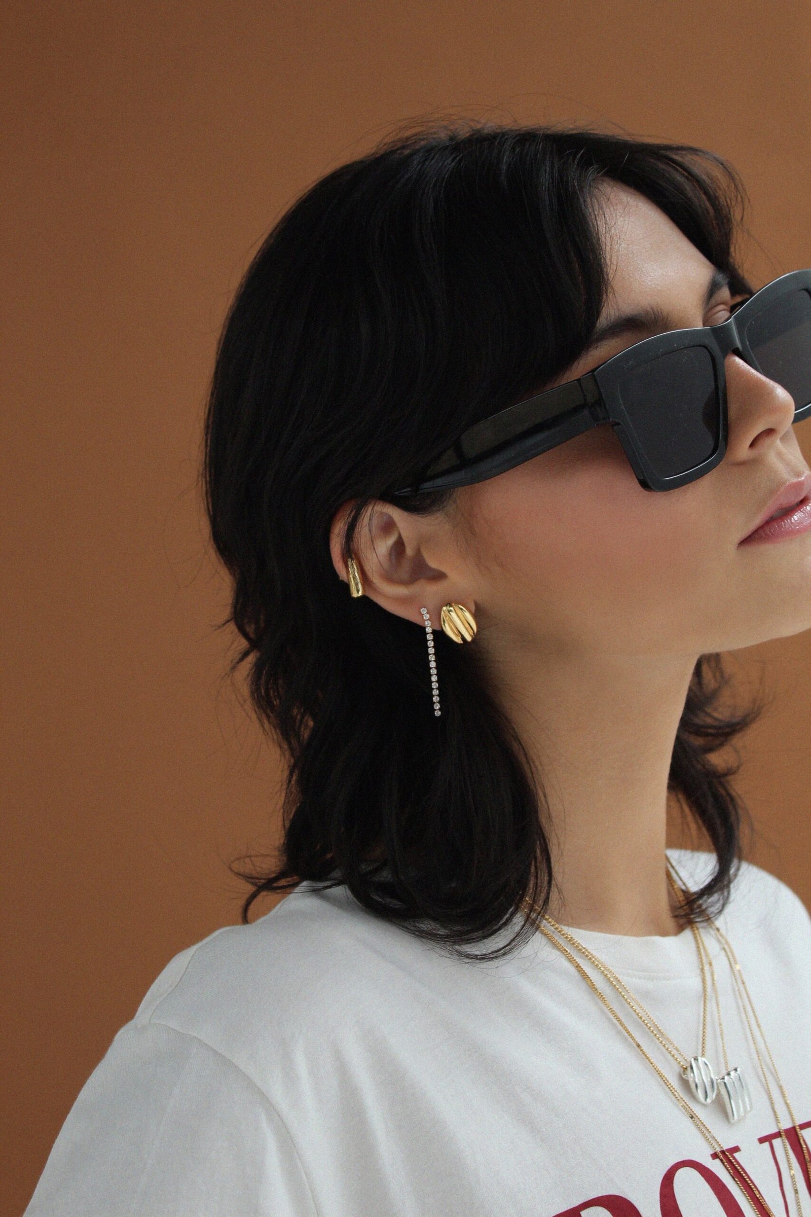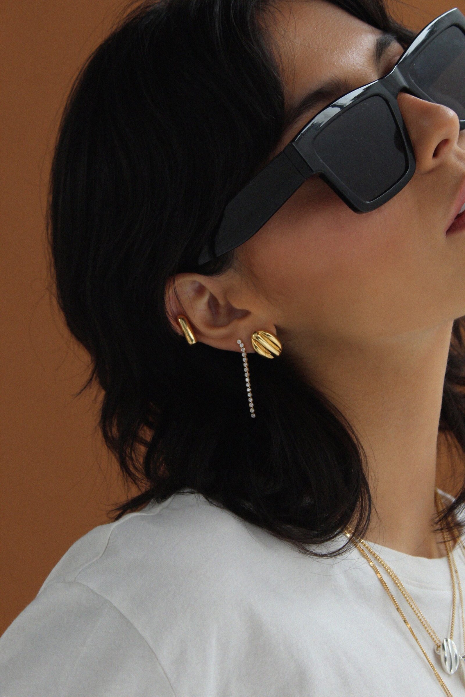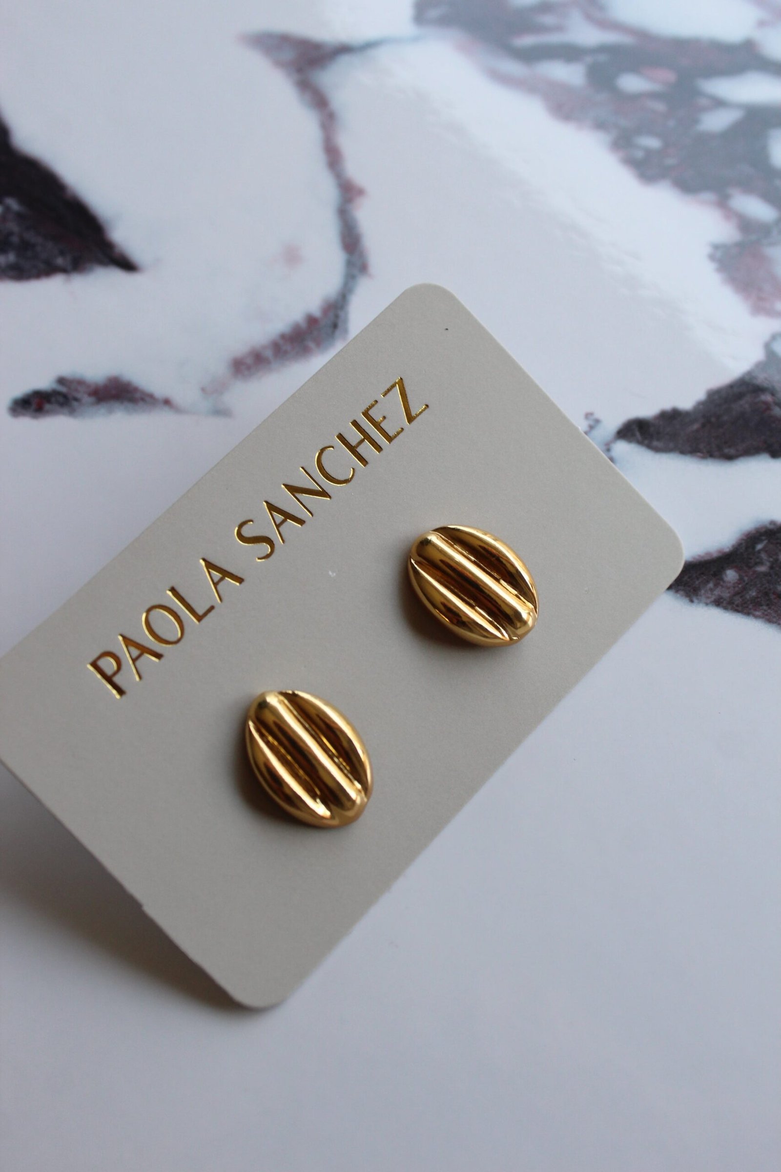 Oval puffy stud earrings and caps crafted from a metal alloy with a 22k gold plating.