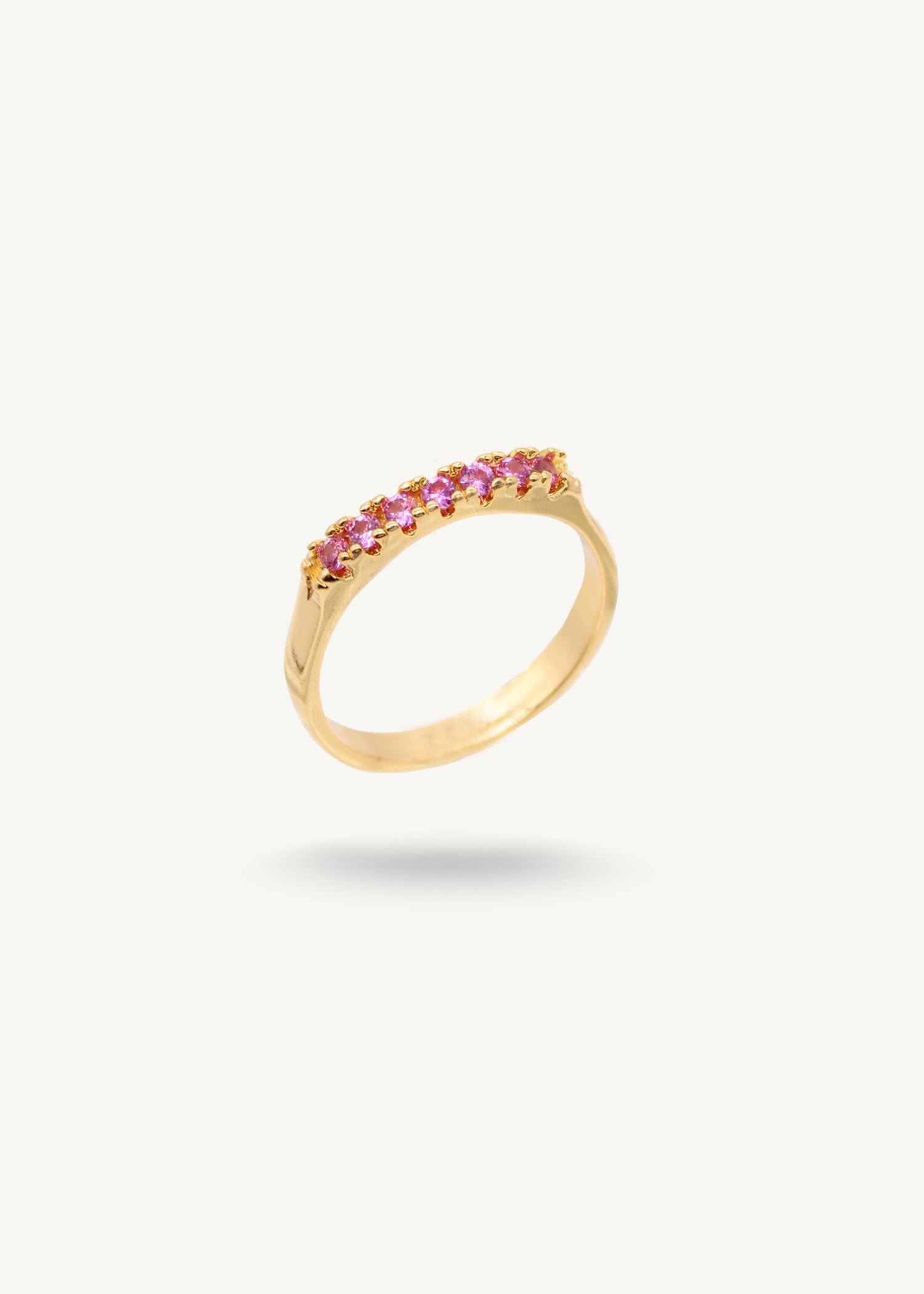 Ring with fuchsia cubic zirconia stones. crafted from a metal alloy with a 22k gold plating.