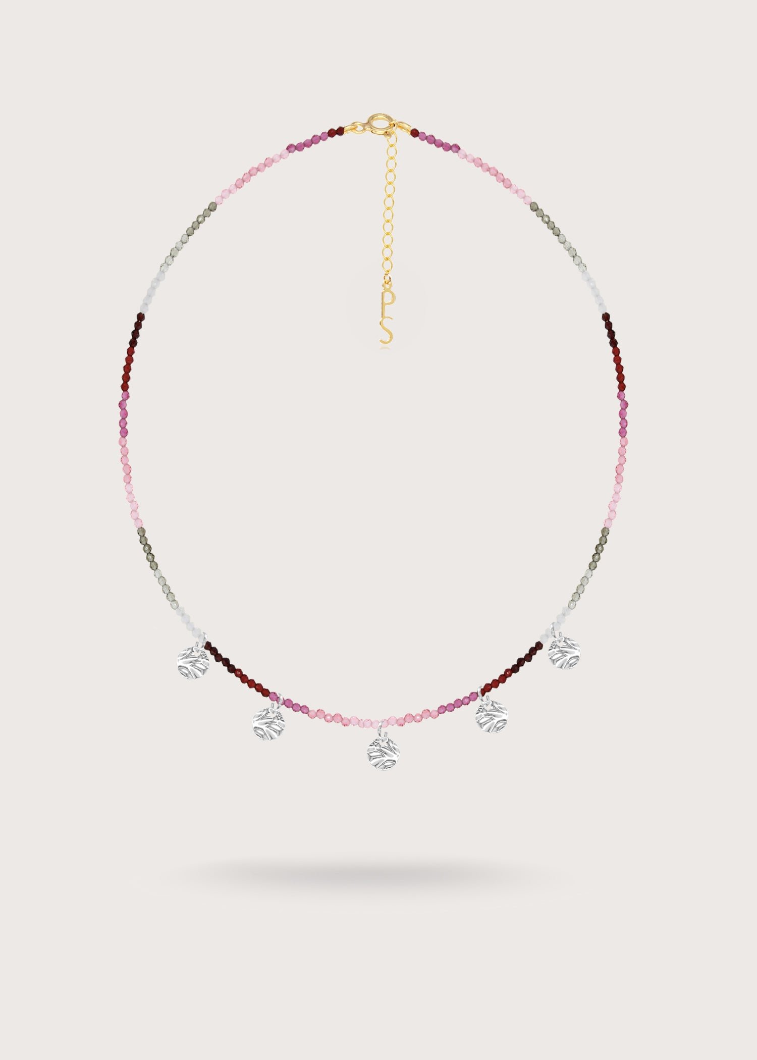 Necklace in a mix of 2mm faceted crystals (burgundy. pink. and gray) + mini drops in silver-plated bronze.